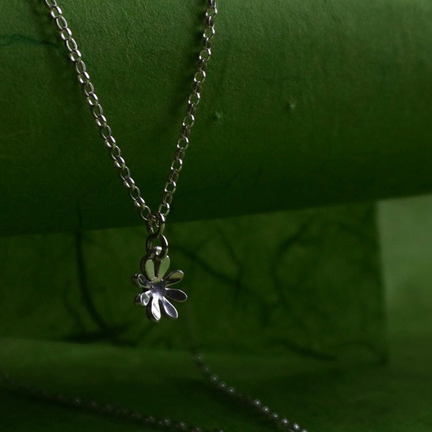 Versatile, light and a little bit rustic. Each daisy comes either domed or flat, and comes on a 16" belcher chain - also available as studs, or as drop earrings.